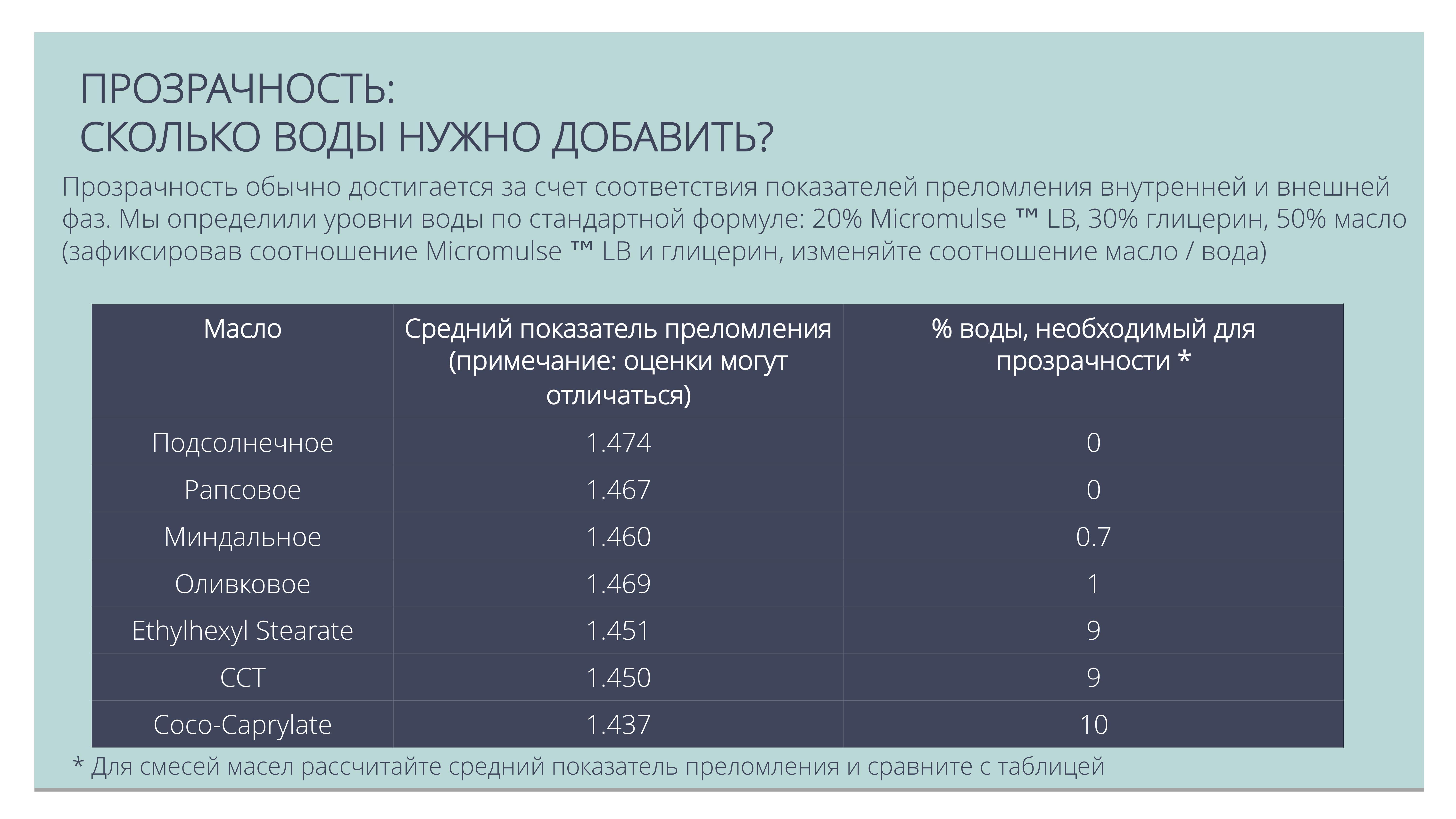 Позволяет создавать ультра актуальные прозрачные мицеллярные масла для очищения кожи и снятия макияжа, продукты для купания («молочные ванны»), гидрофильные масла для душа.
